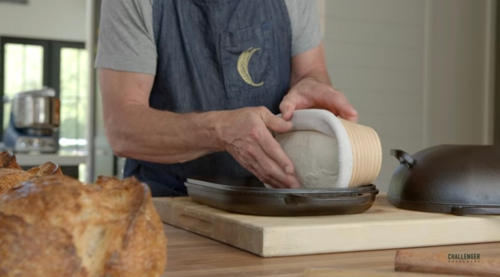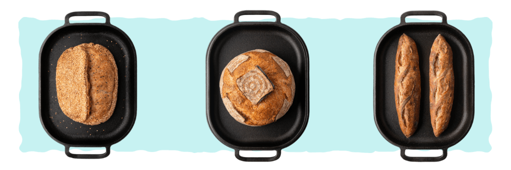 Prenez votre banneton et déposez le pain directement dans la cocotte en fonte. Cette cocotte vous permet de faire différents types de pain : pains ronds, ovales et baguettes.