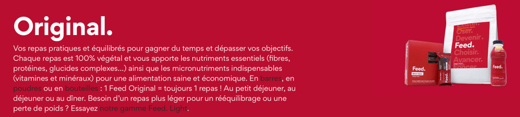 C’est pourquoi Feed propose des barres, poudres ou bouteilles de sa célèbre recette Original à destination des gens pressés souhaitant déjeuner rapidement.