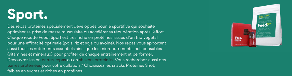 Les repas Feed c’est également à destination des sportifs : repas protéinés ou repas énergétiques. Tous les sportifs trouveront un repas en adéquation avec ses besoins.
