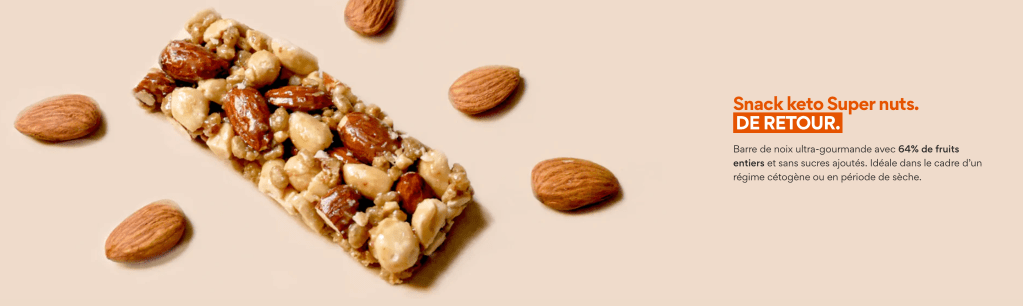 Le régime Cétogène n’est pas oublié par la marque en proposant le snack Keto Super Nuts. Riche en oméga 3 et en protéines, cette barre entre parfaitement dans un régime Cétogène.
