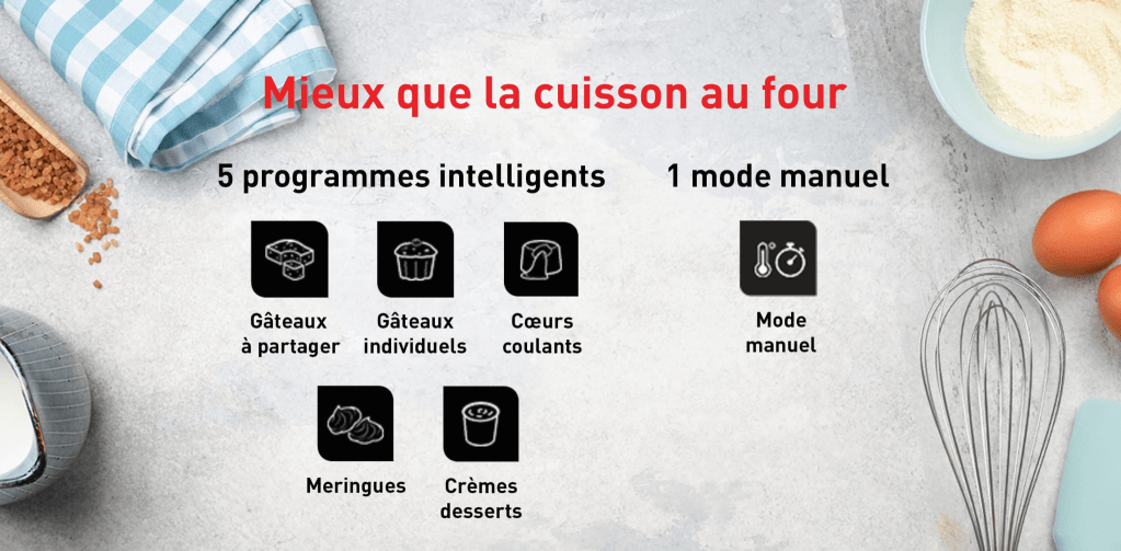Le produit permet une cuisson parfaite de tous vos gâteaux, meringues et coeurs coulants, desserts habituellement très complexes à réaliser dans un four traditionnel.