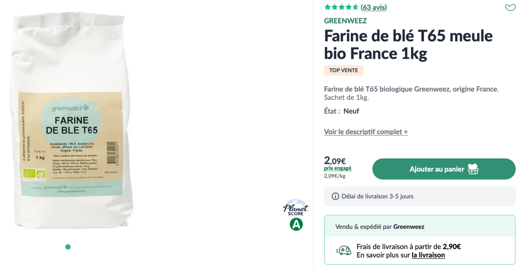 Prenons maintenant l’exemple de 1 kilo de farine T65 idéale pour la réalisation d’un pain tradition. Encore une fois, La Fourche est encore très bien placé, avec une farine accessible à 12% mois cher que sur Greeweez.