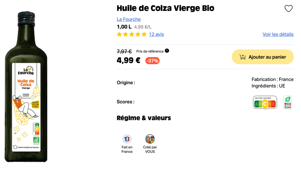 L’huile de colza de La Fourche est accessible à 4,99€ contre 6,49€ sur Greeweez.