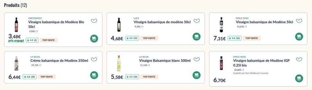 Prenons l’exemple du vinaigre balsamique, La Fourche en propose 5 à son catalogue contre 12 chez Greeweez. Un gain de temps très important lors des courses du quotidien, avec des courses réalisées en quelques minutes.