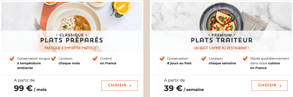La marque propose deux formules différentes : classique et premium. La formule classique est celle qui est le plus plébiscitée, accessible à partir de 239€ (99€ le premier mois) par mois soit 7,7€ par jour, c’est l’une des offres la plus agressive du marché. A ce tarif, les plats sont envoyés tous les mois et sont livrés sous vide, après avoir été cuisinés par un Chef en France.