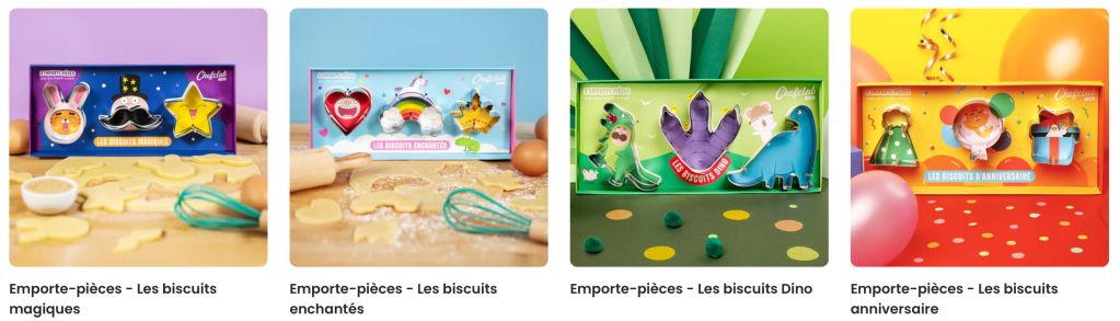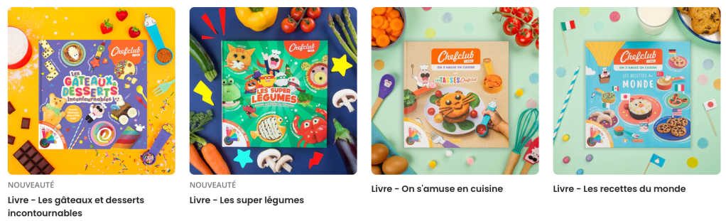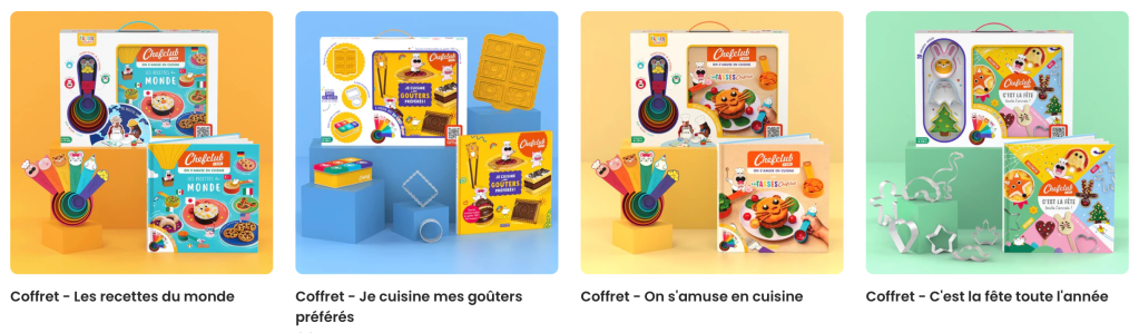 La société propose différents coffrets par thème : « recettes du monde », « je cuisine mes goûters préférés », « on s’amuse en cuisine », « c’est la fête toute l’année ».