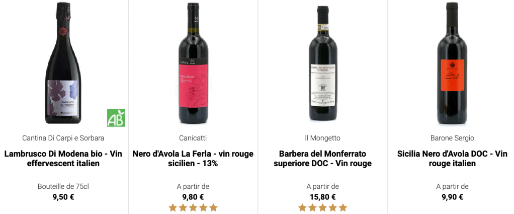 Amazon propose également de très bons vins italiens, surtout dans des périodes spécifiques comme Noël et la foire aux vin. Amazon propose une livraison Prime en 24h et vous permettra de faire un cadeau de dernière minute.