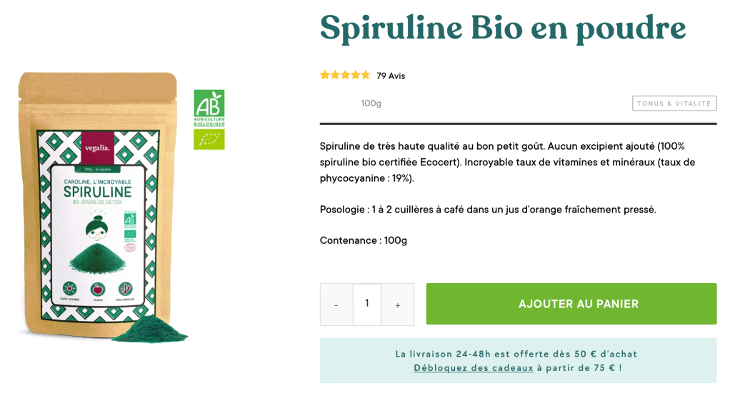 Nutri&Co n’est pas la seule plateforme proposant de la spiruline de qualité. La concurrence propose également de très bonnes spirulines aux compositions proches de celle de Nutrition&Co. C’est le cas notamment de Vegalia, la plateforme française veut démocratiser les compléments alimentaires de qualité au plus grand nombre, le tout en étant le plus éco-responsable possible.