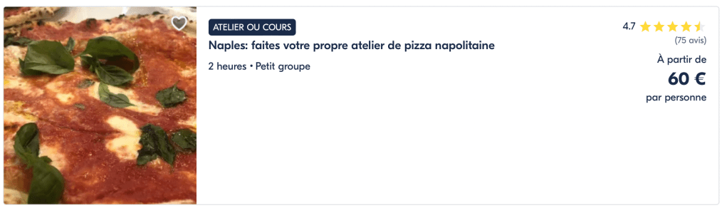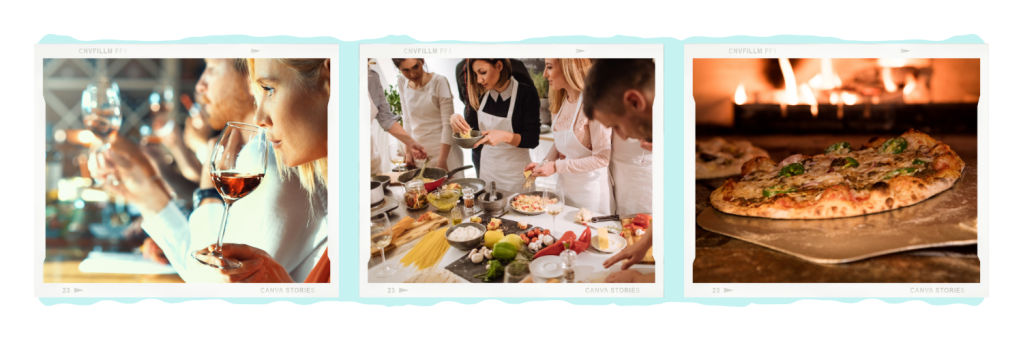 Il existe différentes activités culinaires en France et en Italie. Il est possible de réaliser des véritables pizzas napolitaines dans une pizzeria napolitaine ou encore réaliser des véritables pâtes fraiches dans la cuisine d’un chef Italien.